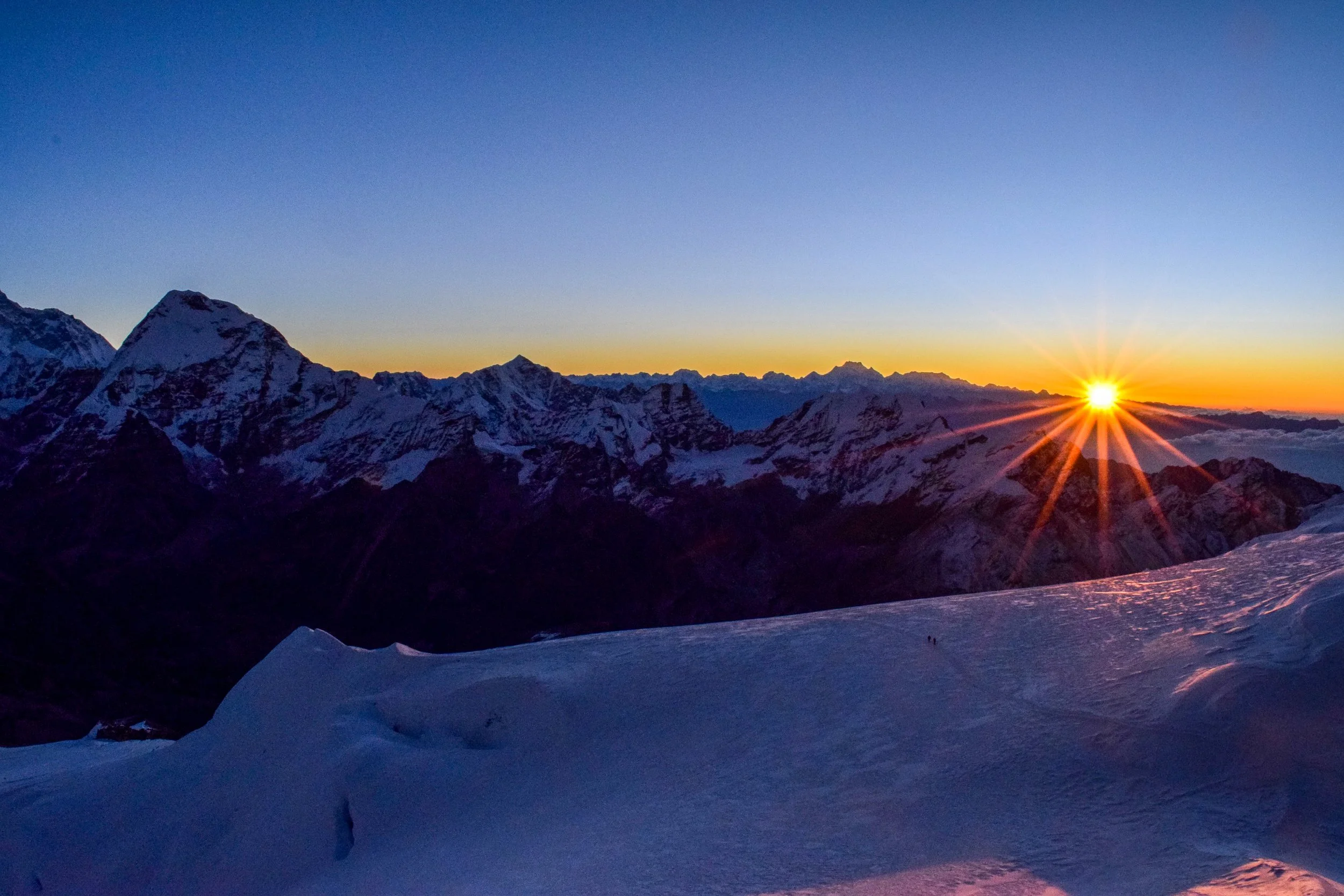 The sun began to rise over the Himalayas in the east and lit the dramatic peaks with a fiery orange and red. After another thirty minutes, we made it to the ridge just below the peak. On either side of us, dramatic snow banks dropped off for thousands of feet. As we crossed the ridge we felt the wind powerfully whip up and over the mountain. The first rays of dawn blanketed the snow and Mera’s Peak glowed in front of us like a lost jewel. From high camp to summit it took us just under three hours.